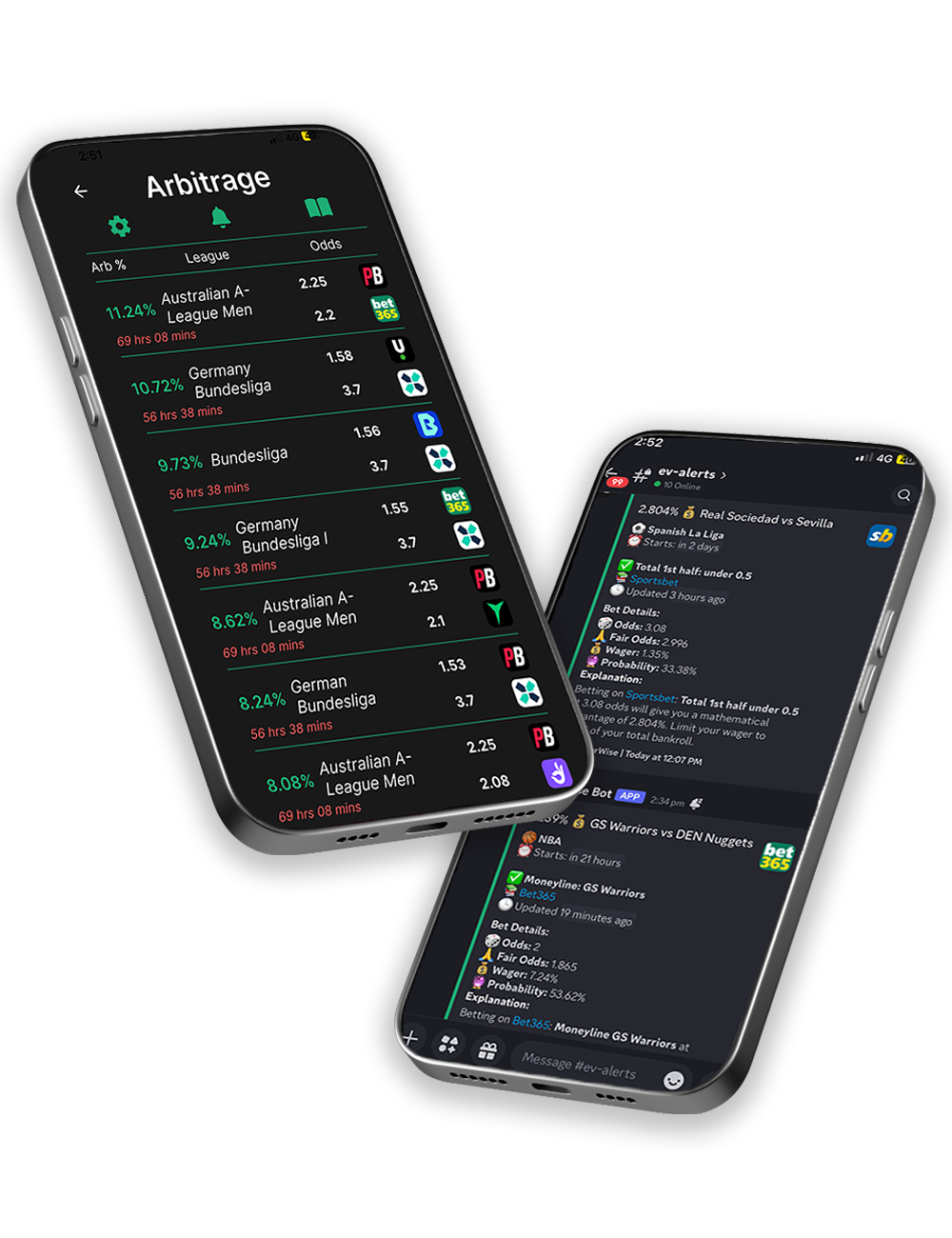 Connect our Arbitrage, +EV, Bonusbet, and Middles betting bots directly to your Discord or Telegram group. Your users get profitable bets around the clock — or integrate directly with our Odds API for full control.